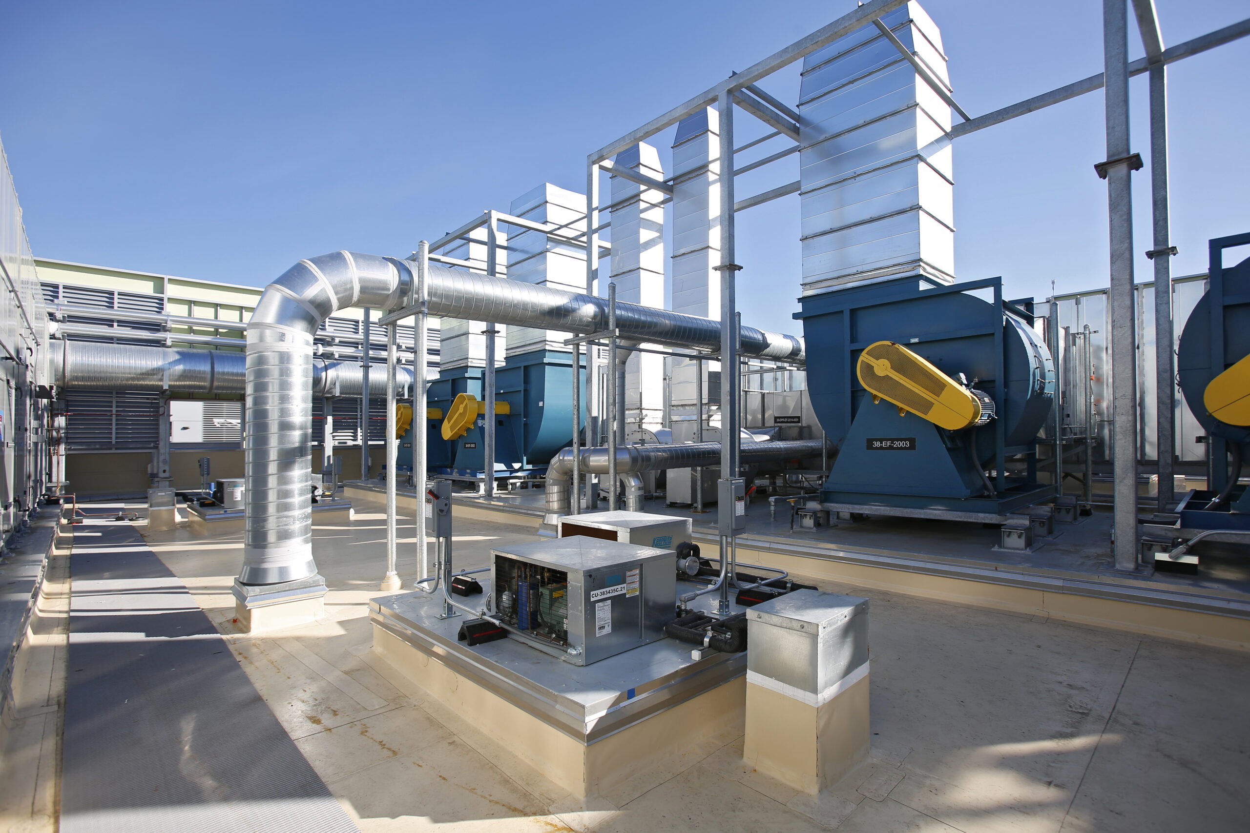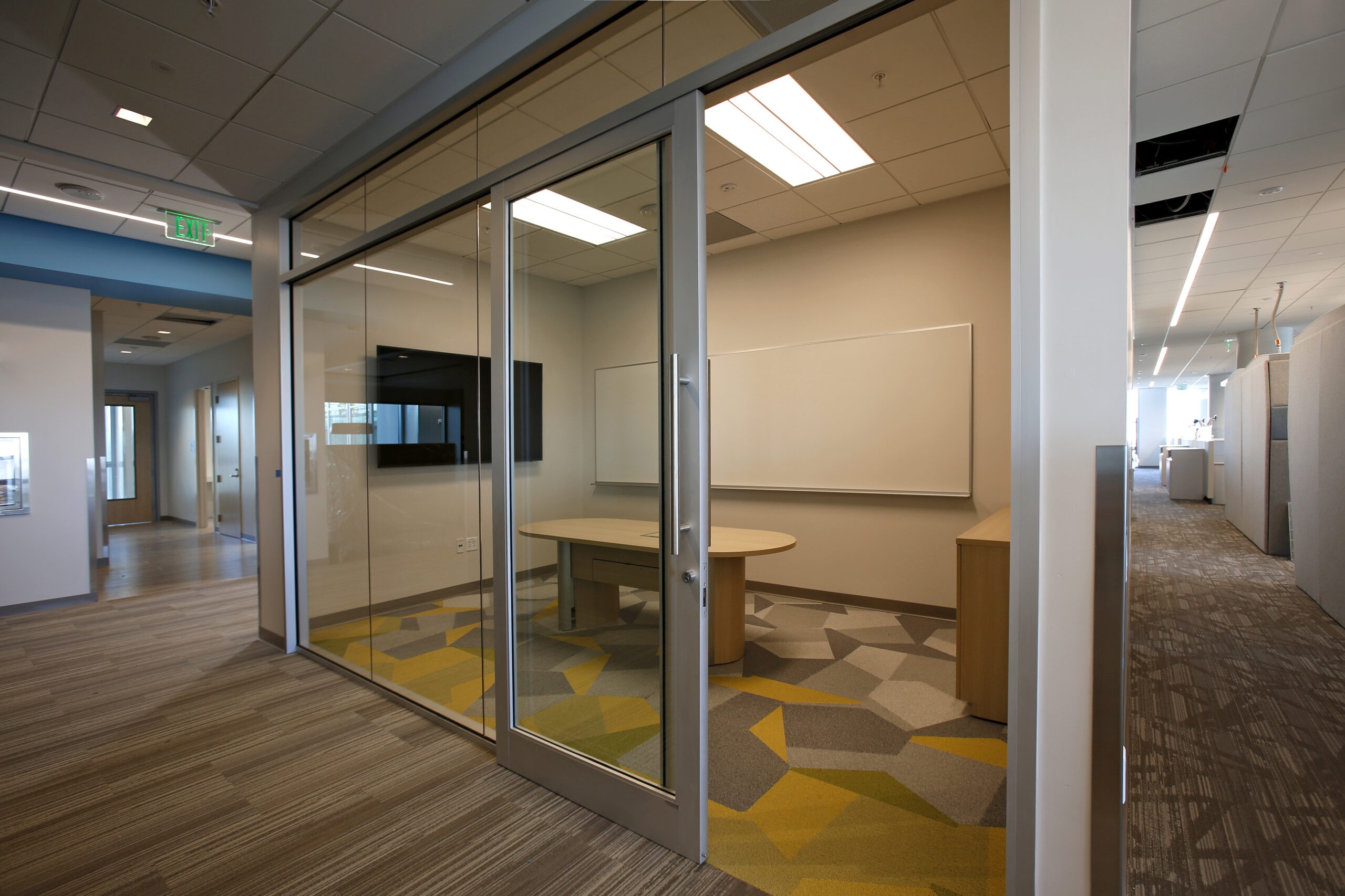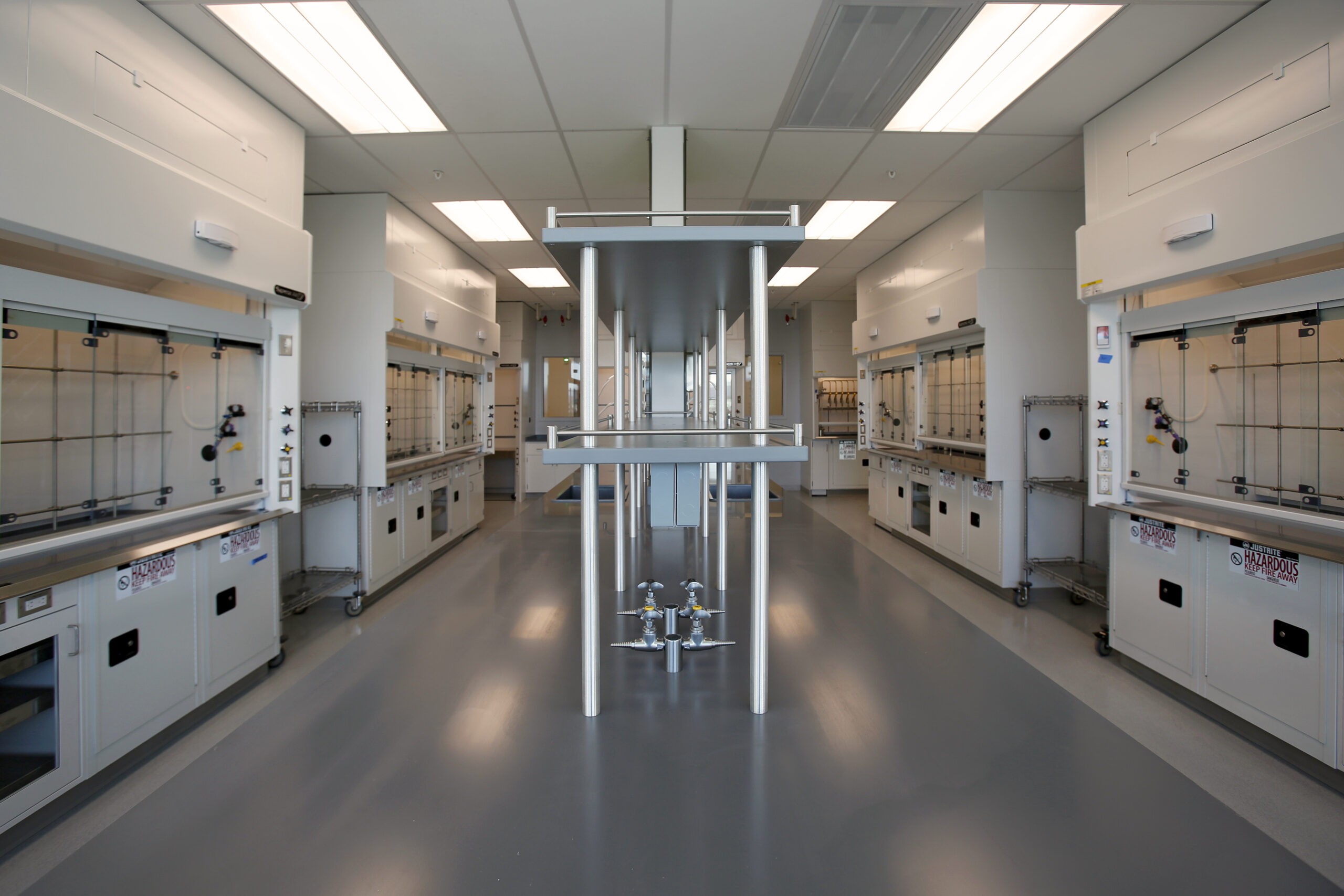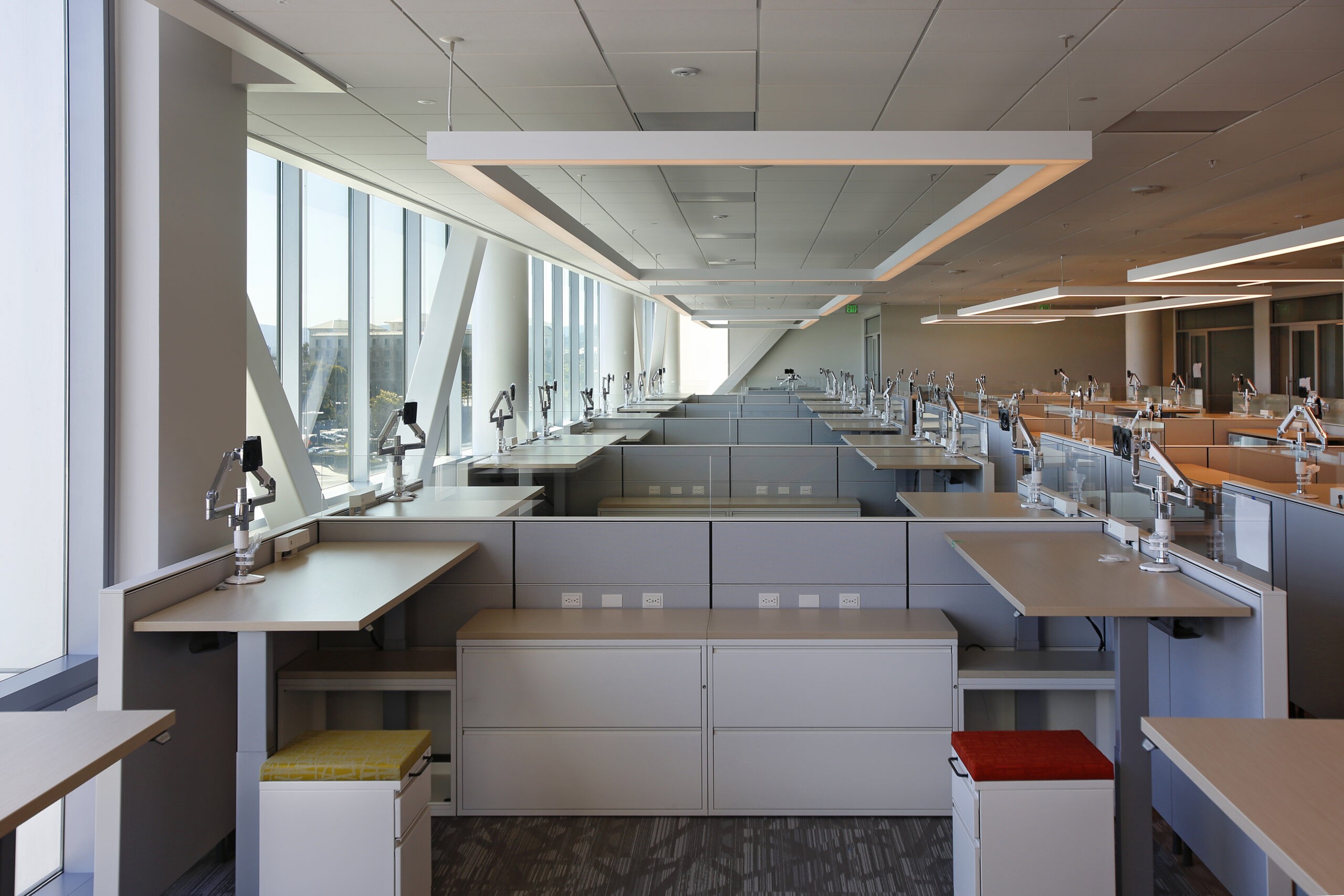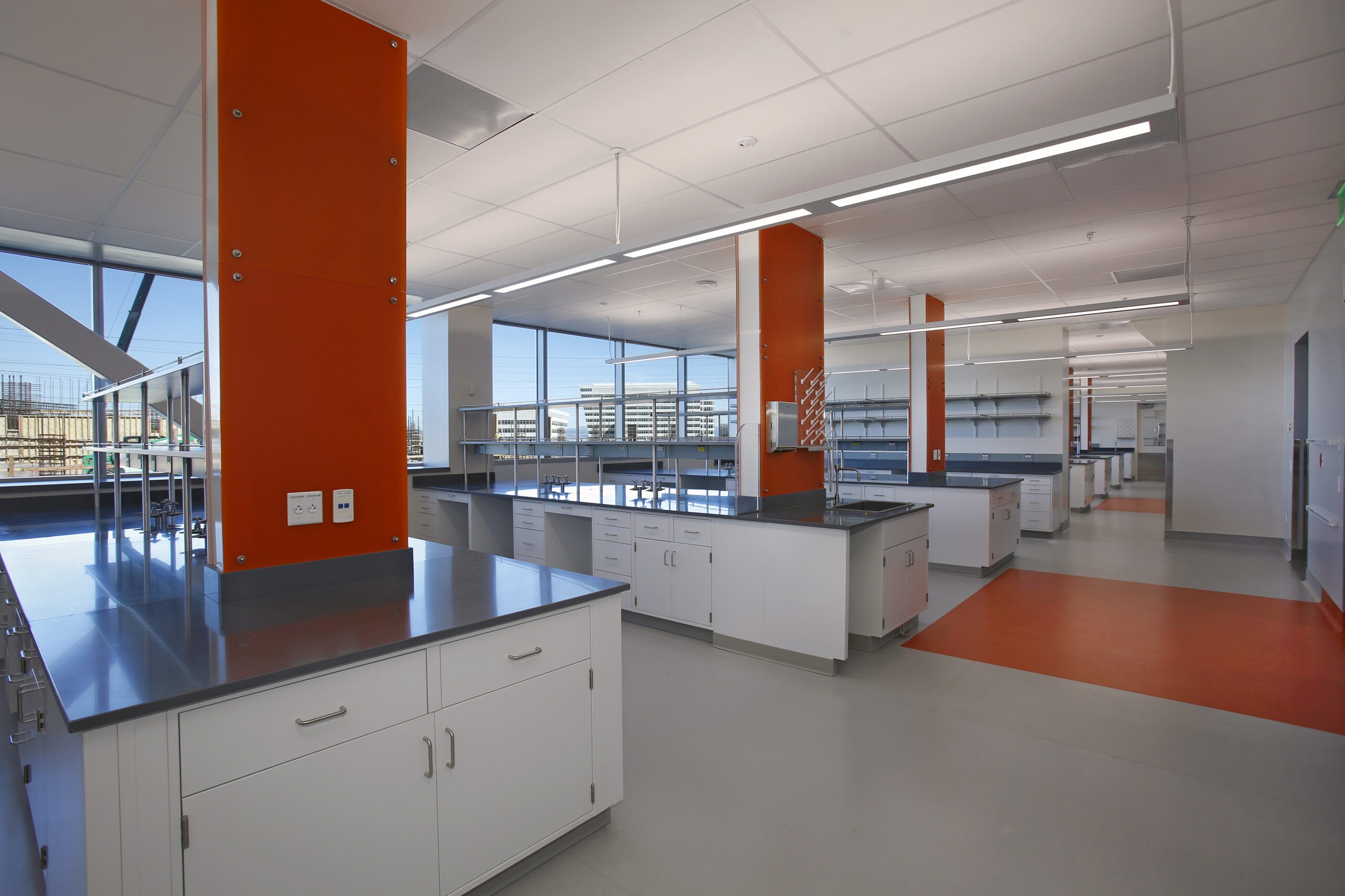 Complementing the research facility is a 190,000-square-foot, six-story cast-in-place parking structure with 519 stalls, connected to the laboratory and office building via a pedestrian sky bridge. The open-air garage features exterior metal panels and precast paneling, and was designed with future sustainability in mind—prepped for additional EV charging stations and rooftop solar panels to support Gilead’s environmental goals.