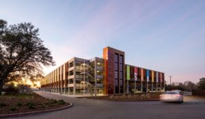 Innovative 488,000 sf, five-level design-build parking structure with 1,500 stalls and site work and solar elements